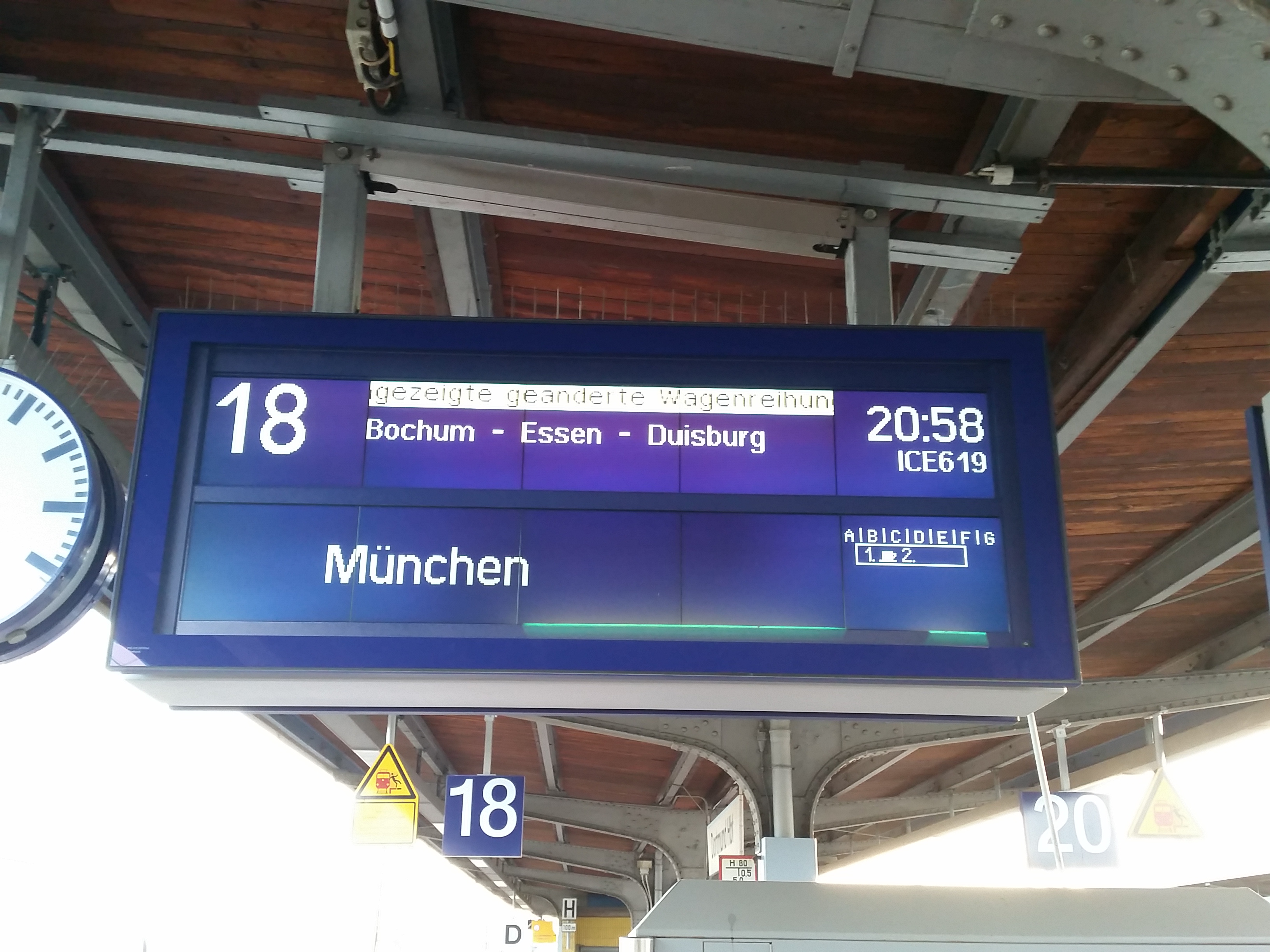 Ca. 10 Minuten vor planmäßiger Abfahrtszeit wurde der ICE in geänderter Wagenreihung bereitgestellt.