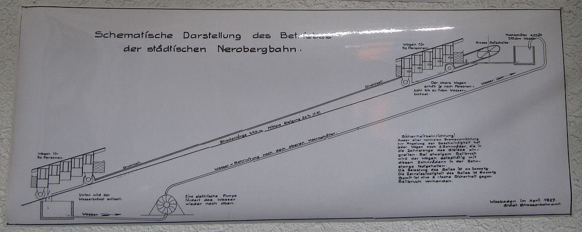 Jetzt kommt die blaue Röhre in den Mittelpunkt: Sie ist nichts anderes als die Tankstelle. Die Nerobergbahn ist eine Zahnstangenstandseilbahn, die mit Wasserballast betrieben wird. Die Details zur Funktionsweise sind auf Wikipedia nachzulesen.